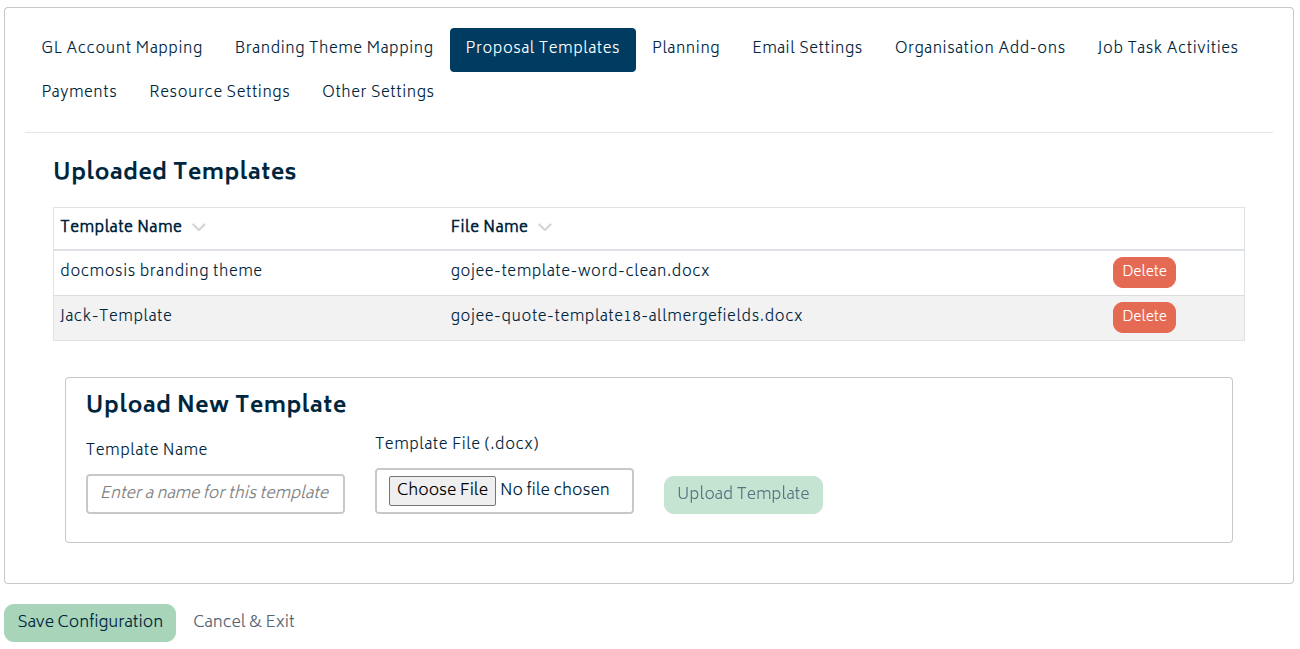 When active, a new “Proposal Templates” tab will be visible in Organisation Setup. You can upload your .docx templates here directly.