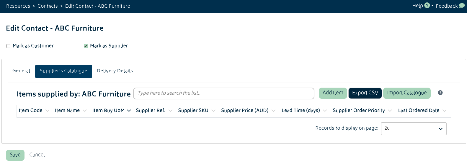 The supplier catalogue tab on a contact’s page is used to bulk import a catalogue of items that a supplier can supply.