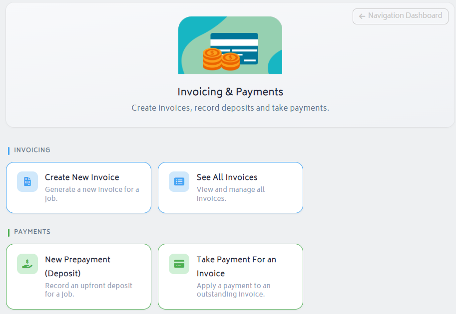 To get started, navigate to the Job Actions menu for a job and select Prepayments. Alternatively you can click Invoicing & Payments on the navigation dashboard and click “New Prepayment (Deposit)”.