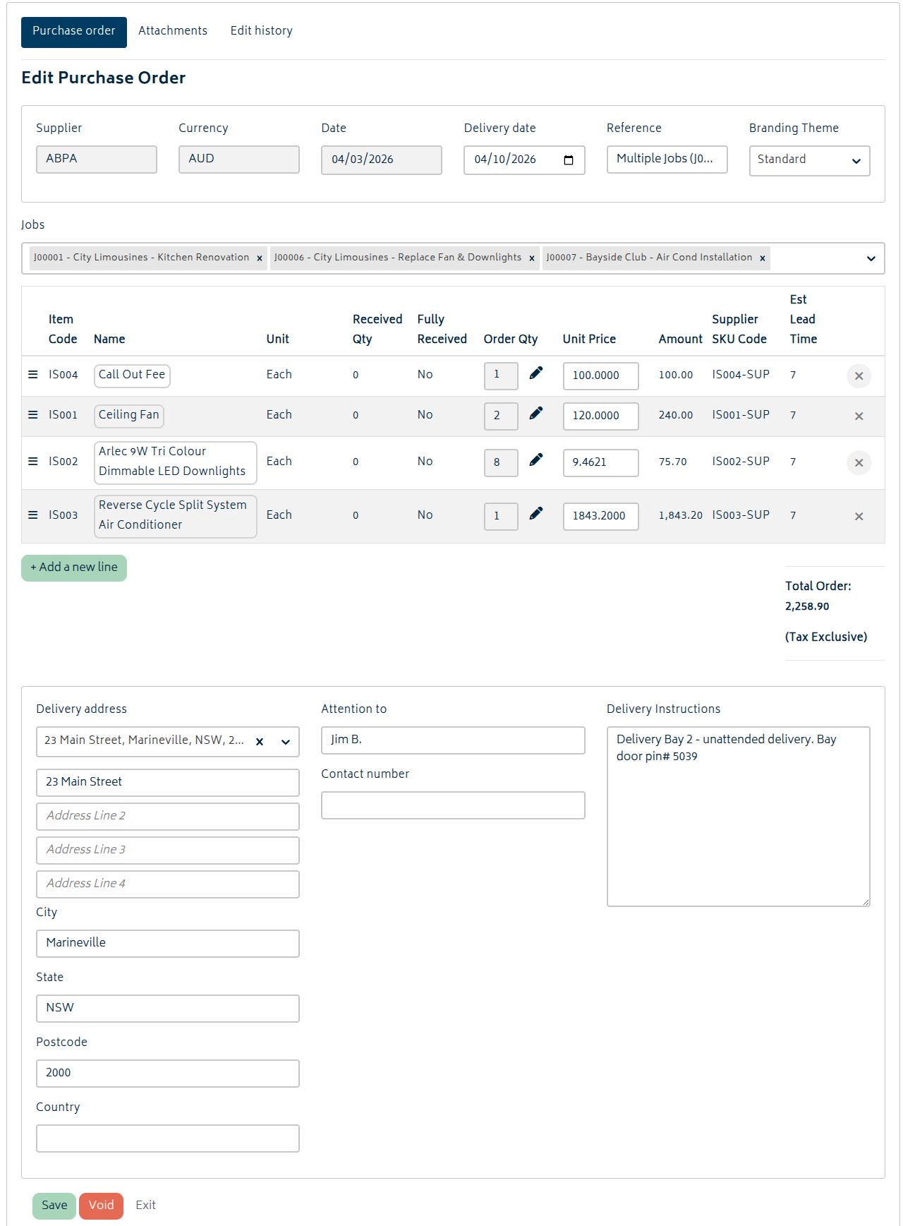You can make the necessary changes, save and exit. The PDF for the purchase order will be regenerated with the new information and Xero will be updated. Lines can be rearranged, item descriptions edited, quantities can be updated and new reservations/jobs added to the PO, the Xero branding theme can be changed, and the delivery date/reference can be modified to suit. However, the date field, supplier, and currency are fixed upon creation of the PO and cannot be changed.
