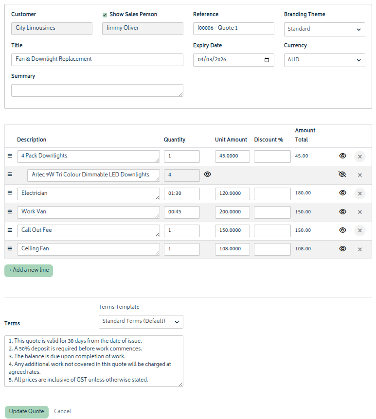 From this screen, make any changes required and select Update Quote to update it. The quote will be updated in the system, and the selected Xero branding theme will be applied to the new version of the quote to create a new PDF link. Refer to Create Quotes and Estimates for more information on these options.