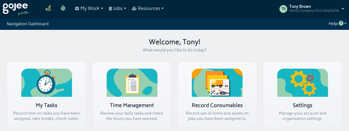 When you log in to Gojee, you will be greeted with this screen as your home screen. It can be accessed at any time from the Navigation icon next to the clock at the top of the screen.