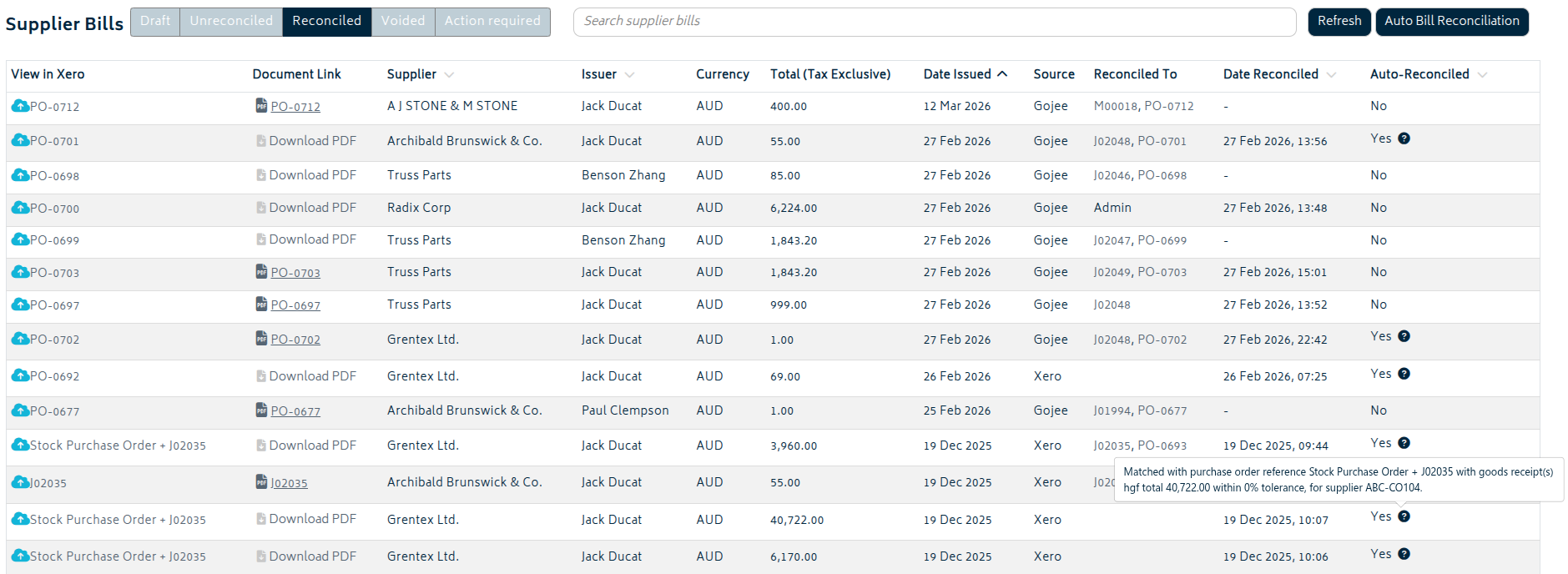 A selection of supplier bills that have been auto-reconciled in Gojee.