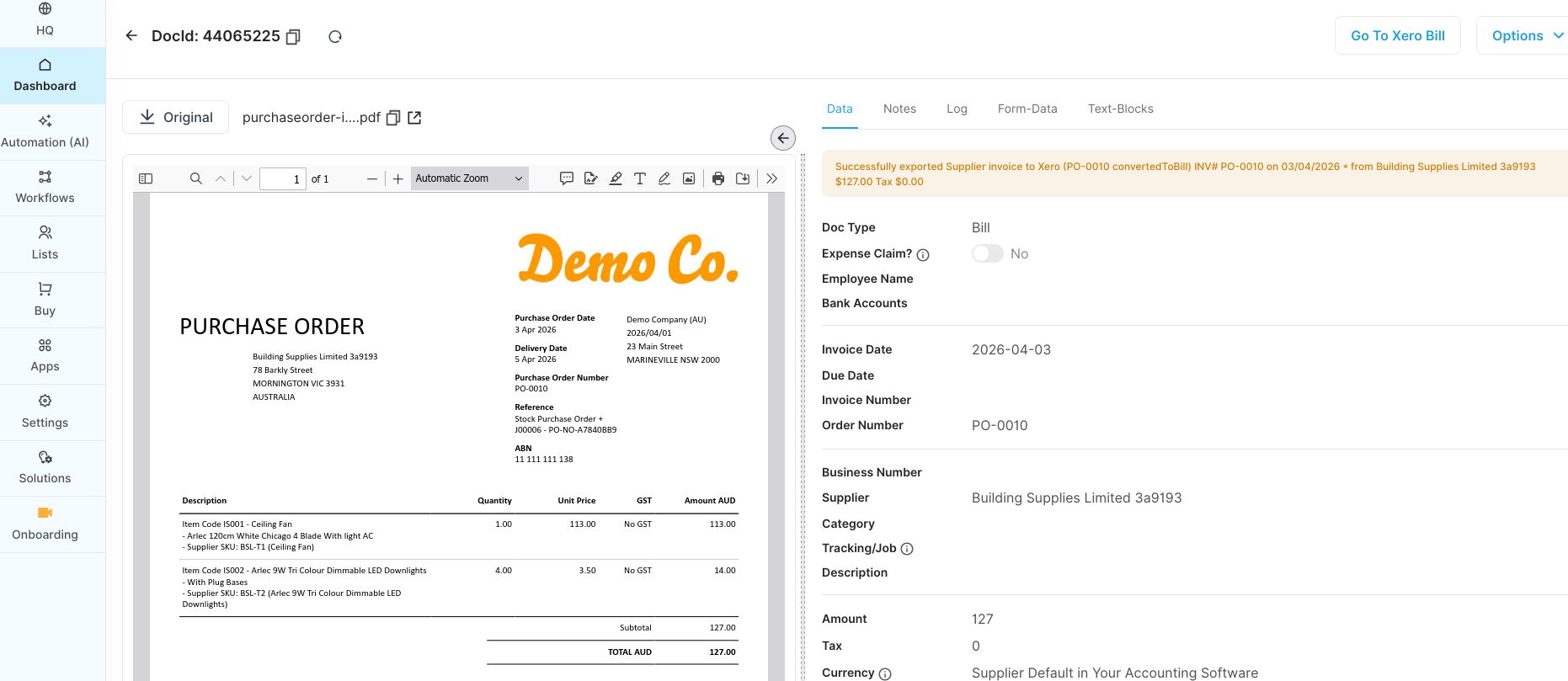 - EzzyBills captures the invoice details via OCR and creates the supplier bill in Xero.