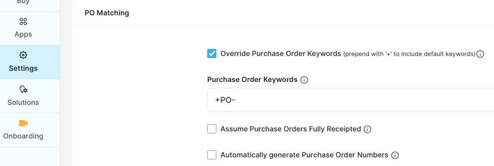 - Specifically – disable “Automatically generate Purchase Order Numbers” and enable the PO keyword “+PO-“. This is necessary to get the Reference field of the PO to populate (shown in EzzyBills as the Order Number):