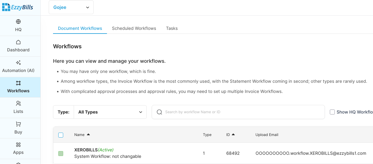 - Ensure the XEROBILLS workflow is active: