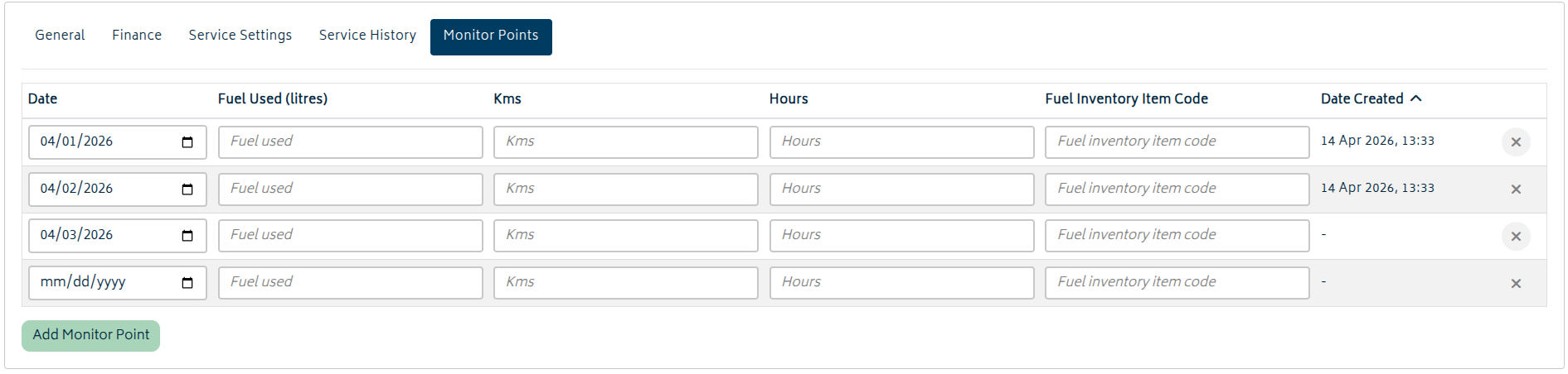 Monitor Points are per-instance usage readings stored with the asset instance. Each row tracks operational values used for servicing and reporting. The following fields are available for entry: