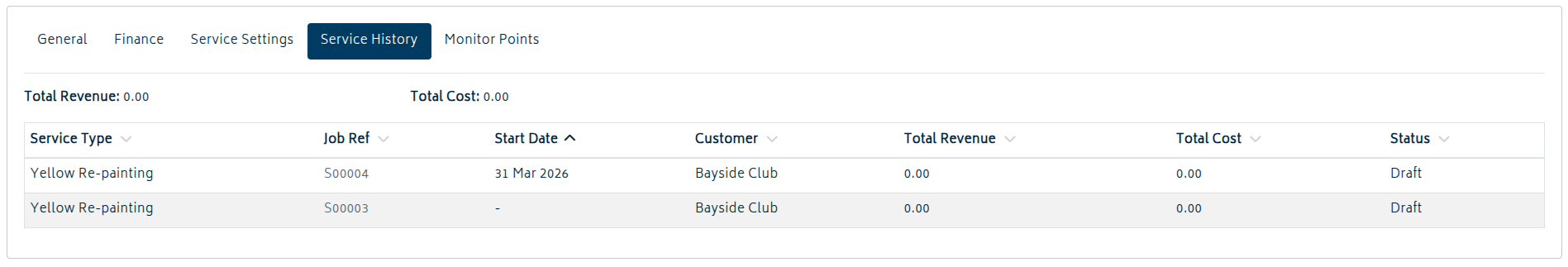 The Service History tab on an asset instance shows service jobs linked to that instance, including: