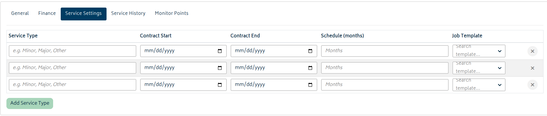 The table lets you add one or more service rows using Add Service Type. These are used in conjunction with the organisation scheduling window to automatically generate draft service jobs for the asset during the period of the contract. Each service row requires all of the following entries: