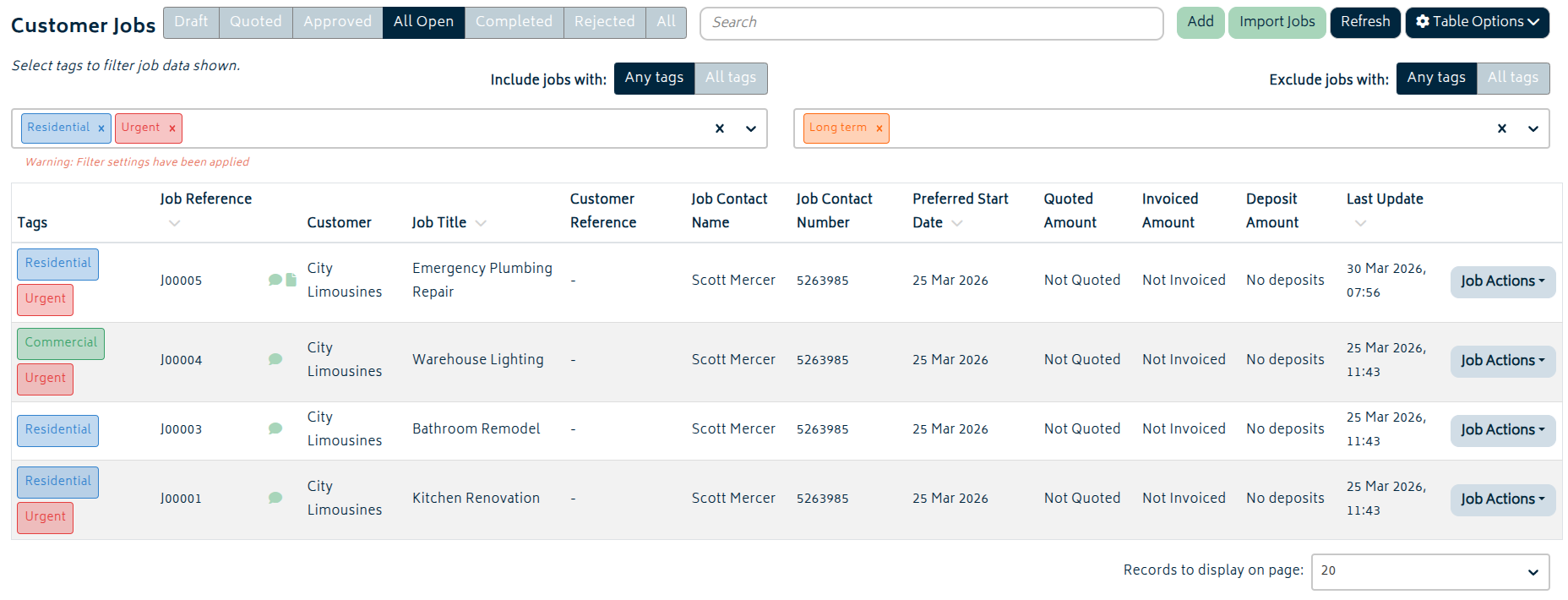 You can then use these to filter from the job list, much the same way as you are able to use other filters. If tags are used on jobs, the Tags column will appear on the job list and display several tags the job is associated with for quick review. You can filter using “any” and “all” tags.